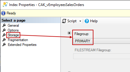 If we switch over to Storage, you’ll see that it has a Filegroup because it is physically stored in a database: