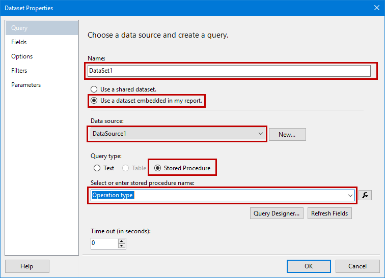 Now that the data sources have been set, the next step in order is to specify the data sets. As was the case with the data source creation, bring up the context menu by clicking on the “Datasets” and select the “Add Dataset…” option. In the “Dataset Properties” dialog, provide the dataset name and opt for the “Use a dataset embedded in my report option” by clicking on the appropriate radio-button. Then, choose the data source we’ve just created, and opt for the “Stored Procedure” as the Query type. Finally, select the Stored Procedure from the drop-menu and click “OK” to complete this step. Note: to further fine-tune the dataset, configure the various options in the “Fields”, “Options” and other tabs of the “Dataset Properties” dialog.