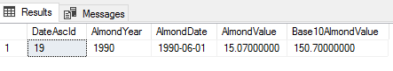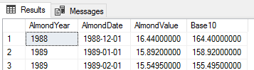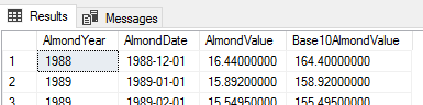 The data set in these examples I use queries 362 values of a date range between December 1988 to January 2019 of almond values measured by a unit of output. The “AlmondValue” is not important to this tip, while the dates are for the examples. Any monthly stored values will work for these exercises with table name and column name substitutions. For readers who may want to copy queries directly, I’ve provided the below loop which will create these values for you to run these examples – the AlmondValue and Base10AlmondValue will differ in the output when you run these query examples, but the logical design of each query in the examples won’t.