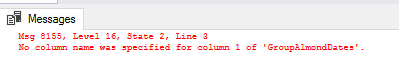 One important point when creating these is that we will get an error if we don’t explicitly name our columns in the wrapped query. Let’s take the same above example and see the error when we remove the column name AlmondYear in the wrapped query: