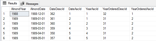 - DateDescId/DataAscId: we see that we have 362 records because we’re getting the row number by the AlmondDate column. The DateAscId orders the date from 1 to 362, while the DateDescId orders the date from 362 to 1
