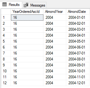 ;WITH GroupAlmondDates AS( SELECT ROW_NUMBER() OVER (ORDER BY AlmondDate DESC) DateDescId , ROW_NUMBER() OVER (ORDER BY AlmondDate ASC) DateAscId , ROW_NUMBER() OVER (PARTITION BY YEAR(AlmondDate) ORDER BY YEAR(AlmondDate) ASC) YearAscId , DENSE_RANK() OVER (ORDER BY YEAR(AlmondDate) DESC) YearOrderedDescId , DENSE_RANK() OVER (ORDER BY YEAR(AlmondDate) ASC) YearOrderedAscId , YEAR(AlmondDate) AlmondYear , AlmondDate , AlmondValue , (AlmondValue*10) Base10AlmondValue FROM tbAlmondData ) SELECT AlmondYear , AlmondDate , DateDescId , DateAscId , YearAscId , YearOrderedDescId , YearOrderedAscId FROM GroupAlmondDates |