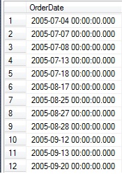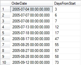 DECLARE @start_date DATE = '2005-07-01'; DECLARE @end_date DATE = '2008-07-31'; SELECT OrderDate, DATEDIFF(DAY, @start_date, OrderDate) AS DaysFromStart FROM #order_dates ORDER BY OrderDate |