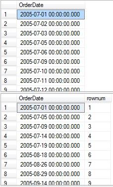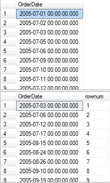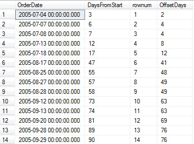 WITH CTE_DAYSFROMSTART AS ( SELECT OrderDate, DATEDIFF(DAY, @start_date, OrderDate) AS DaysFromStart FROM #order_dates) SELECT OrderDate, DaysFromStart, ROW_NUMBER() OVER (ORDER BY DaysFromStart) AS rownum, DaysFromStart - ROW_NUMBER() OVER (ORDER BY DaysFromStart) AS OffsetDays FROM CTE_DAYSFROMSTART |