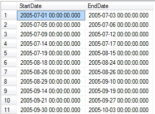 WITH CTE_DATEDIFF AS ( SELECT OrderDate, DATEDIFF(DAY, @start_date, OrderDate) AS DaysFromStart, DATEDIFF(DAY, @start_date, OrderDate) - ROW_NUMBER() OVER (ORDER BY DATEDIFF(DAY, @start_date, OrderDate)) AS OffsetDays FROM #order_dates) SELECT DATEADD(DAY, MIN(DaysFromStart), @start_date) AS StartDate, DATEADD(DAY, MAX(DaysFromStart), @start_date) AS EndDate FROM CTE_DATEDIFF GROUP BY OffsetDays; |