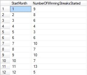SELECT DATEPART(MONTH, CTE_StartDates.OrderDate) AS StartMonth, COUNT(DATEPART(MONTH, CTE_StartDates.OrderDate)) AS NumberOfWinningStreaksStarted FROM CTE_StartDates INNER JOIN CTE_EndDates ON CTE_StartDates.rownum = CTE_EndDates.rownum GROUP BY DATEPART(MONTH, CTE_StartDates.OrderDate) |