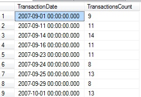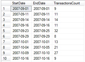 DECLARE @start_date DATE = '2007-09-01'; DECLARE @end_date DATE = '2008-07-31'; WITH CTE_TRANSACTIONS AS ( SELECT TransactionHistory.TransactionDate, COUNT(*) AS TransactionsCount FROM Production.TransactionHistory INNER JOIN Production.Product ON TransactionHistory.ProductID = Product.ProductID WHERE Product.Name LIKE '%Mountain Tire%' AND TransactionHistory.TransactionType = 'S' GROUP BY TransactionHistory.TransactionDate HAVING COUNT(TransactionID) < 15), CTE_DATEDIFF AS ( SELECT TransactionDate, DATEDIFF(DAY, @start_date, TransactionDate) AS DaysFromStart, DATEDIFF(DAY, @start_date, TransactionDate) - ROW_NUMBER() OVER (ORDER BY DATEDIFF(DAY, @start_date, TransactionDate)) AS OffsetDays, TransactionsCount FROM CTE_TRANSACTIONS) SELECT DATEADD(DAY, MIN(DaysFromStart), @start_date) AS StartDate, DATEADD(DAY, MAX(DaysFromStart), @start_date) AS EndDate, SUM(TransactionsCount) AS TransactionsCount FROM CTE_DATEDIFF GROUP BY OffsetDays; |