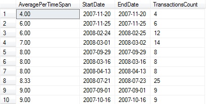 WITH CTE_AVERAGES AS ( SELECT StartDate, EndDate, DATEDIFF(DAY, StartDate, EndDate) + 1 AS TimeSpan, TransactionsCount FROM #Transaction_Data) SELECT TOP 10 CAST(CAST(TransactionsCount AS DECIMAL) / CAST(TimeSpan AS DECIMAL) AS DECIMAL(10,2)) AS AveragePerTimeSpan, StartDate, EndDate, TransactionsCount FROM CTE_AVERAGES ORDER BY CAST(TransactionsCount AS DECIMAL) / CAST(TimeSpan AS DECIMAL) ASC |