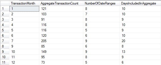 WITH CTE_MONTH_DATA AS ( SELECT DATEPART(MONTH, StartDate) AS TransactionMonth, TransactionsCount, DATEDIFF(DAY, StartDate, EndDate) + 1 AS DaysIncluded FROM #Transaction_Data ) SELECT TransactionMonth, SUM(TransactionsCount) AS AggregateTransactionCount, COUNT(*) AS NumberOfDateRanges, SUM(DaysIncluded) AS DaysIncludedInAggregate FROM CTE_MONTH_DATA GROUP BY TransactionMonth |