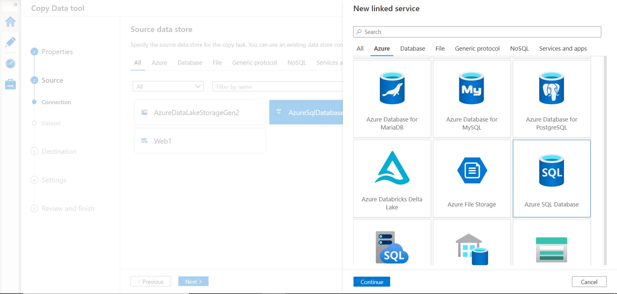 In the next step, we need to register the source database instance. Select Azure SQL database as shown below from the list of supported data sources.