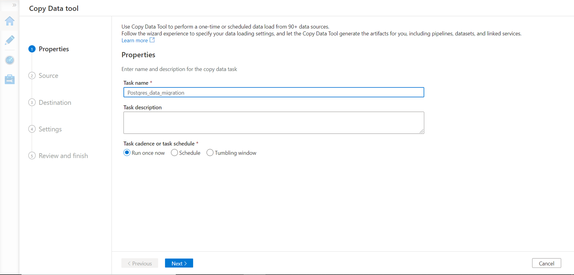 Click on the Copy data tool and it will open the wizard as shown below. For straight-forward data movement where no significant transformation is required, one may use the copy data method. For other complex scenarios, one can use the data flows and build a data pipeline that migrates data objects in batches. Provide the task name and execution frequency. If it’s a one-time migration one may execute the task only once, and if it’s a task where data would be migrated till a cut-over happens, then the task would be scheduled on a recurring frequency.
