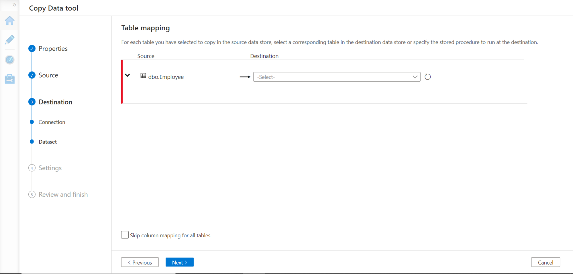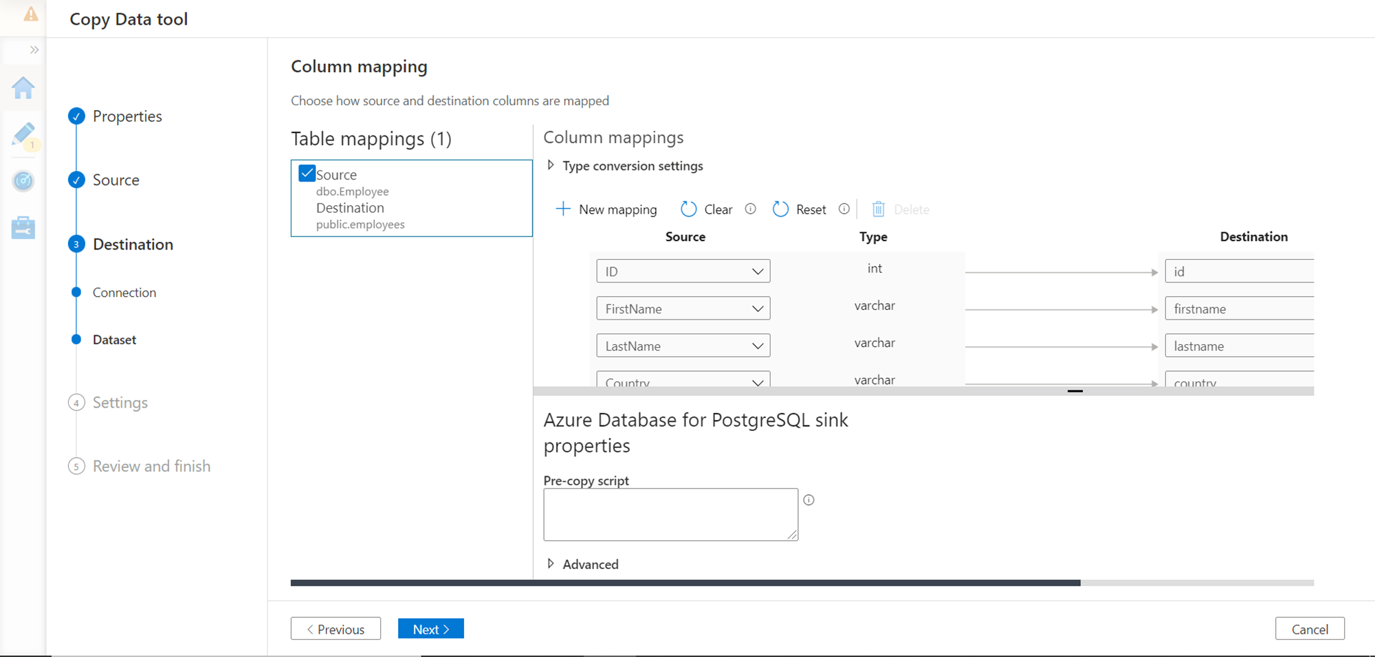 In the next step, we need to provide table mapping. Even if we have a table with the same name in the Postgresql instance, it won’t show up automatically in the mapping as the schema would be public or with a different name in Postgresql while it may be under a different schema in Azure SQL Database. If one expects to have the database objects created when the data pipeline is executed, typically we create database objects first using a different task and then execute the data load tasks.