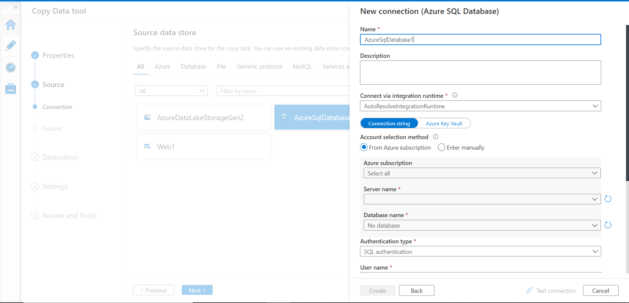 In the next step, we need to provide connection credentials to enable connectivity from Azure Data Factory to Azure SQL Database. Ensure either Azure services are allowed to connect to the database or firewall setting in the database allow the IP of Azure Data Factory or a private connection endpoint of Azure Data Factory is added to Azure SQL Database to allow incoming connections in the database. Click on the Test Connection button to ensure that the connectivity is successful.