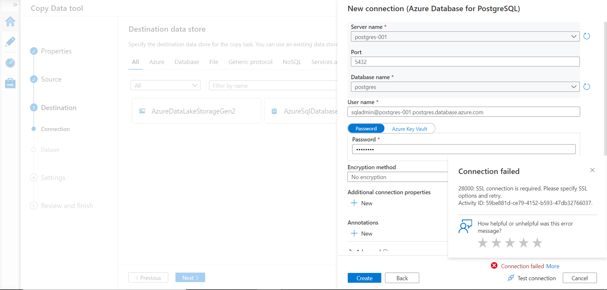 In the next step, we need to provide connection credentials to allow Azure Data Factory to connect to the PostgreSQL instance. There are some settings that are unique here which we need to be aware of. The username should be in the format of <username>@<database-endpoint-name> as shown below. Also seen below are the different types of supported encryptions.