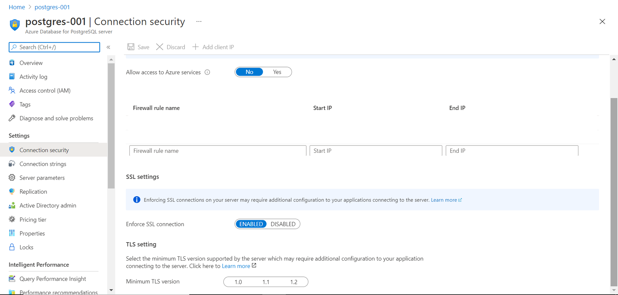 If you verify the Azure Database for PostgreSQL instance settings, you will find that by default it is configured to enforce SSL connections. So here we need to configure the encryption method to require SSL. Once you change the settings, Postgresql will be registered as the destination.