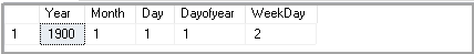 SELECT DATEPART(year, '00:00:00.000') AS [Year], DATEPART(month, '00:00:00.000') AS [Month], DATEPART(day, '00:00:00.000') AS [Day], DATEPART(dayofyear, '00:00:00.000') AS [Dayofyear], DATEPART(weekday, '00:00:00.000') AS [WeekDay]; |
