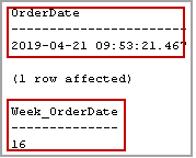 DECLARE @OrderDate DATETIME2= GETDATE(); SELECT @OrderDate AS OrderDate,DATEPART(wk , @OrderDate) AS WeekofYear; |