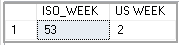 DECLARE @date datetimeoffset = '2010-01-03 00:00:00.000'; SELECT DATEPART(ISO_WEEK, @date) AS 'ISO_WEEK', DATEPART(wk, @date) AS 'US WEEK'; |