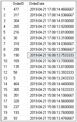 CREATE TABLE Orders (OrderID INT IDENTITY(1, 1), OrderDate DATETIME2 ); GO INSERT INTO Orders(OrderDate) VALUES(DATEADD(hh, -ROUND(60 * RAND(), 0), GETDATE())); GO 500 |