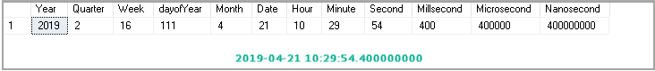 DECLARE @date DATETIME2= GETDATE(); SELECT @date; SELECT DATEPART(YY, @date) AS Year, DATEPART(QQ, @date) AS Quarter, DATEPART(WK, @date) AS Week, DATEPART(DY, @date) AS dayofYear, DATEPART(MM, @date) AS Month, DATEPART(DD, @date) AS Date, DATEPART(hour, @date) AS Hour, DATEPART(minute, @date) AS Minute, DATEPART(second, @date) AS Second, DATEPART(millisecond, @date) AS Millsecond, DATEPART(microsecond, @date) AS Microsecond, DATEPART(nanosecond, @date) AS Nanosecond; |