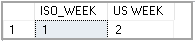 DECLARE @date datetimeoffset = '2012-01-01 00:00:00.000'; SELECT DATEPART(ISO_WEEK, @date) AS 'ISO_WEEK', DATEPART(wk, @date) AS 'US WEEK'; |