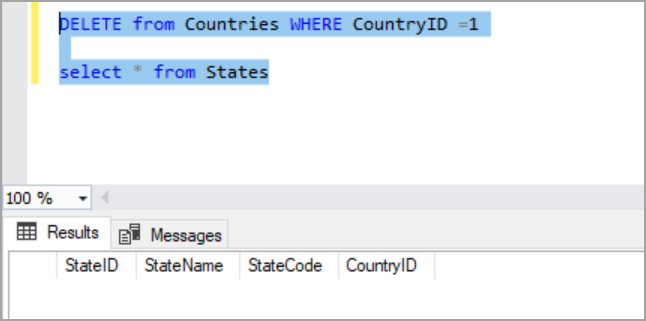 If we try to delete a record with CountryID =1, it will throw an error as delete on parent table “Countries” tries to delete the referencing rows in the child table States. But on Cities table, we have a foreign key constraint with no action for delete and the referenced value still exists in the table.