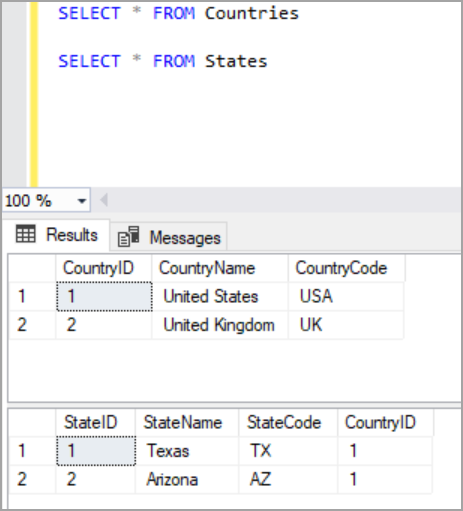 INSERT INTO Countries VALUES (1,'United States','USA') INSERT INTO Countries VALUES (2,'United Kingdom','UK') INSERT INTO States VALUES (1,'Texas','TX',1) INSERT INTO States VALUES (2,'Arizona','AZ',1) |