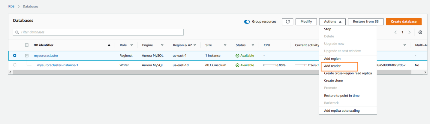In the AWS Aurora cluster configured above, we have a single replica that servers the role of reader and writer. We can configure up to 15 readers in Aurora. Select the cluster and go to Actions. In the actions menu, click on Add reader.