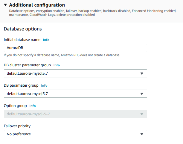 Here, we can specify a few additional configurations for your Amazon Aurora cluster.