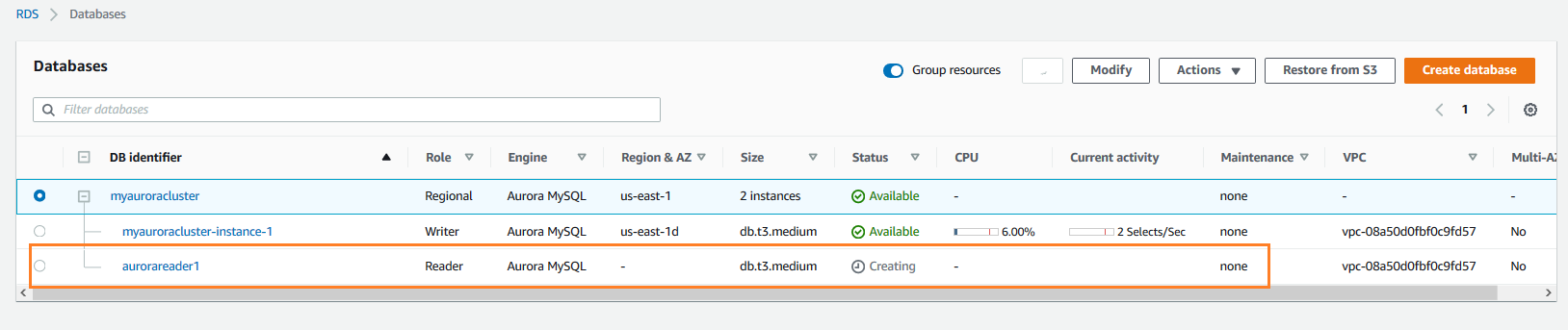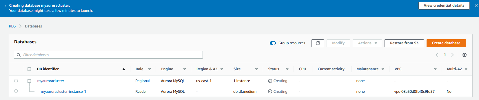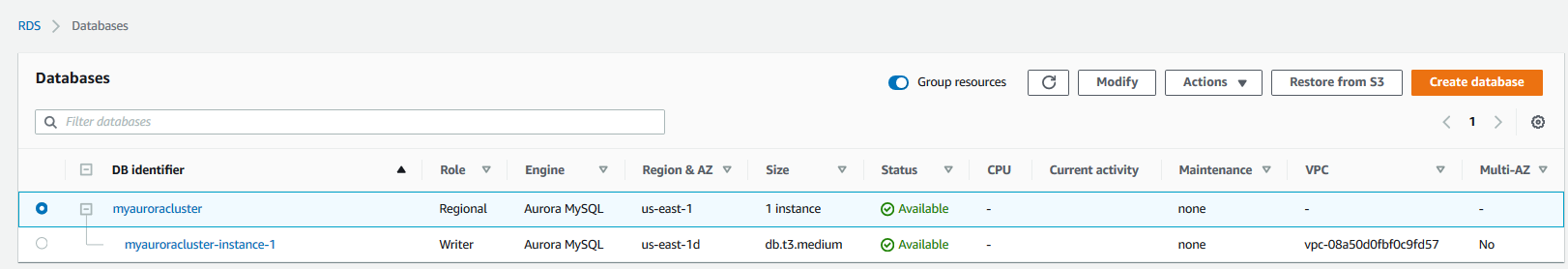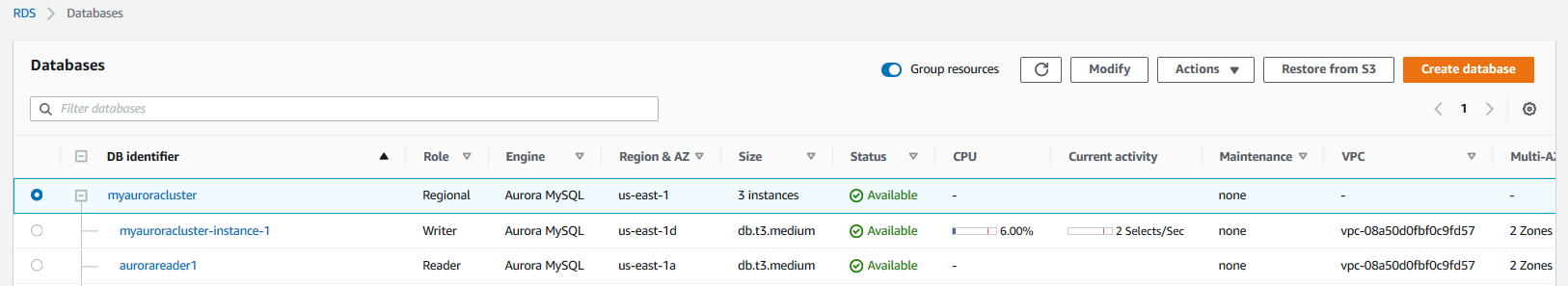 It takes some time for the Aurora cluster to be in the available state. In the below image, we see an aurora cluster with the primary replica.