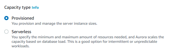- Serverless: In the Serverless capacity, we define the minimum and maximum resources. Aurora allocates and scales the resources automatically based on the workload
