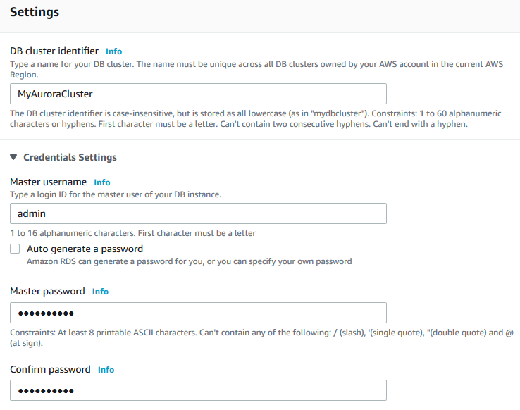- Master user name and password: By default, Aurora creates the master user with the specified password