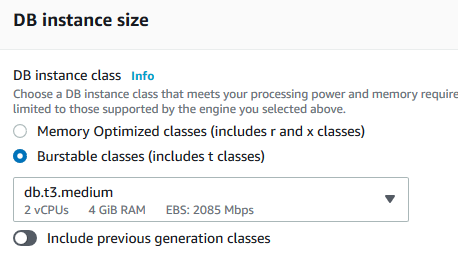 - DB instance size: Select the DB instance size for your aurora reader replica. For production instance, you should use Memory-optimized class