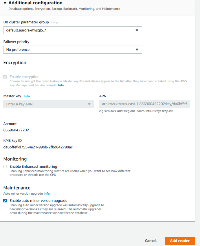 The remaining configurations are the same as deploying an RDS instance. Review the information and click on Add Reader.