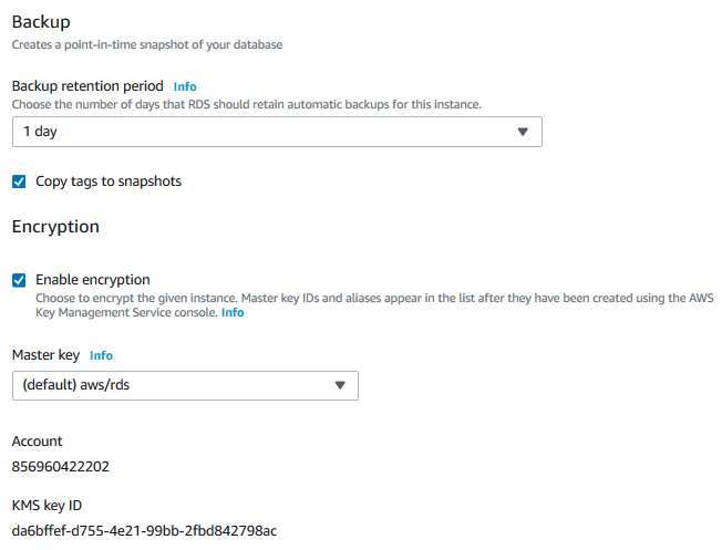 - Enable auto minor version upgrade: If this option is checked, AWS automatically upgrades the minor during the maintenance window