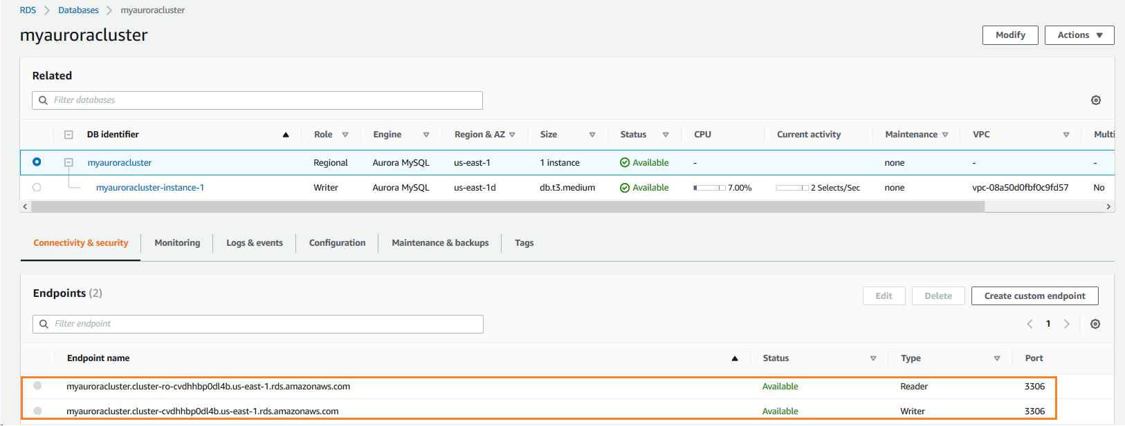 You also get an endpoint for the primary replica. We use the endpoint to connect with the Aurora cluster database.
