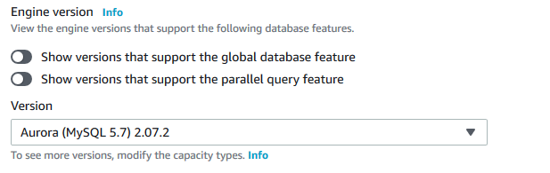 In the engine version, you select the Aurora version. We go with the default version however if you are looking for a specific feature, you should check its compatible version and select it from the drop-down.
