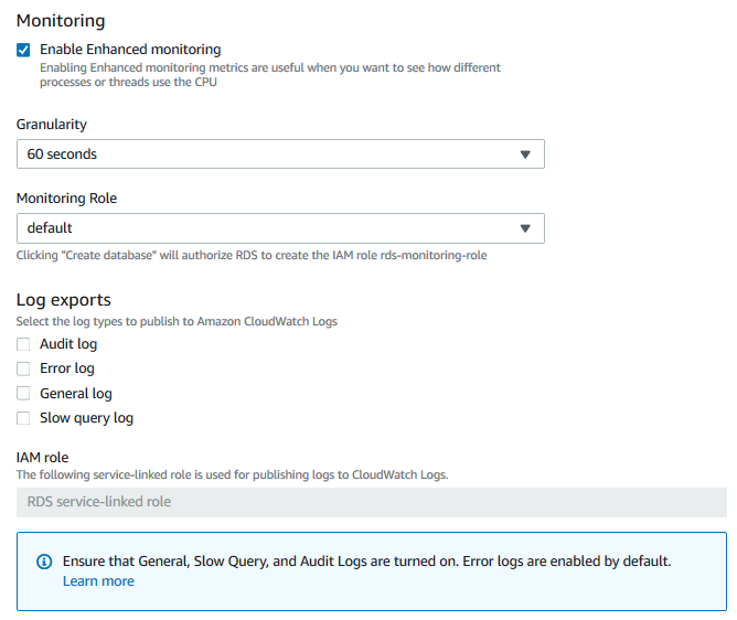 By default, AWS enables the enhanced monitoring for the Aurora cluster and databases with a Granularity of 60 seconds.