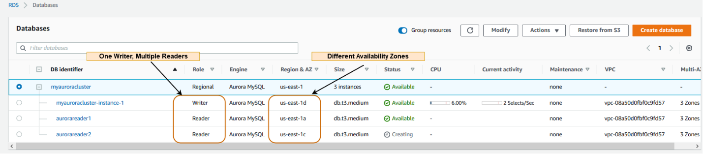 - The read replicas are in separate availability zones; it provides high availability for your Aurora cluster