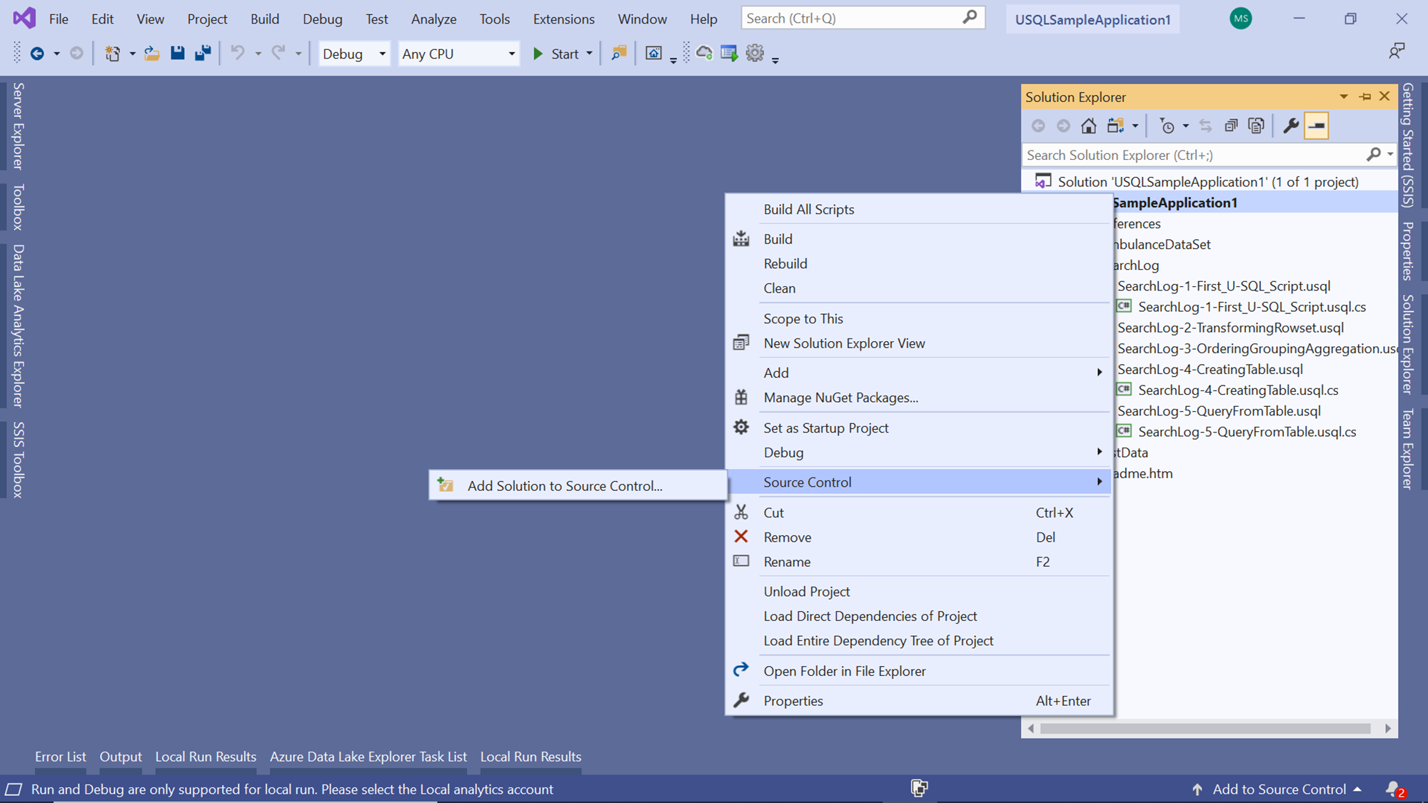 Firstly, we need a U-SQL script that can be executed or deployed on the Azure Data Lake Analytics account. In the previous parts of the article, we created a sample U-SQL application that has ready-to-use scripts, which we tested on local machines as well as using Visual Studio. It’s assumed that you already have this setup available on your local machine as shown below, from where we would be deploying the scripts on the Azure Data Lake Analytics account.