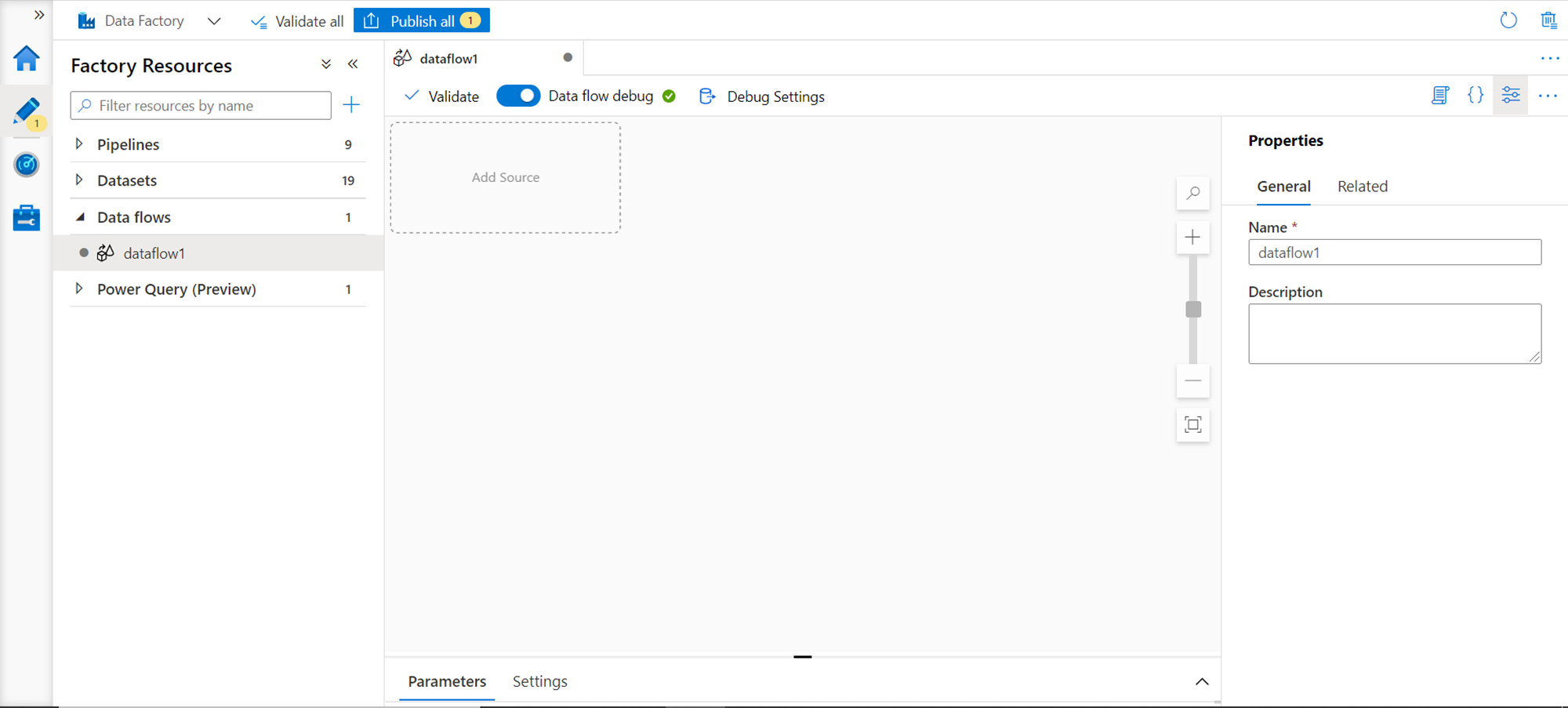 This will open a new layout to develop the data flow as shown below. By default, the data flow debug option is switched off. Turn it on as shown below. It will require selecting the Auto Resolving Integration Runtime. Once you switch it on, it may take a few minutes to get activated. Meanwhile, provide a relevant name for the data flow in the properties section.