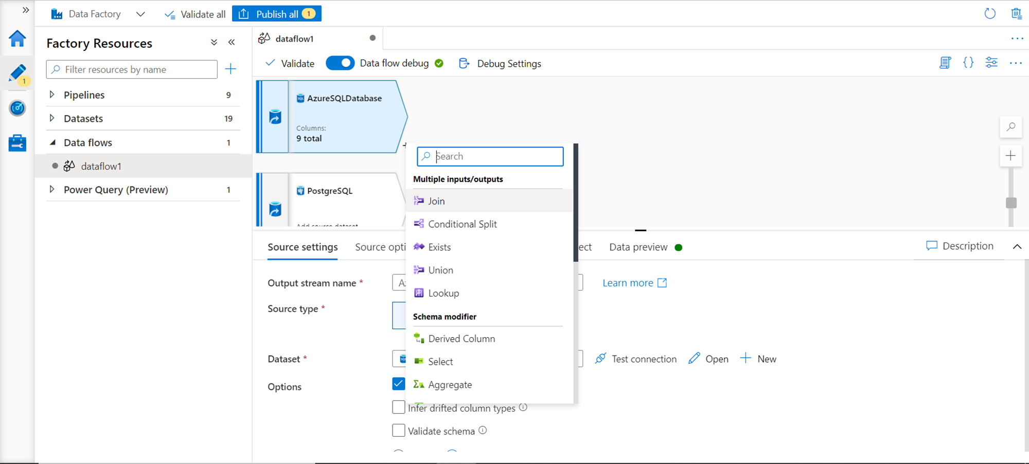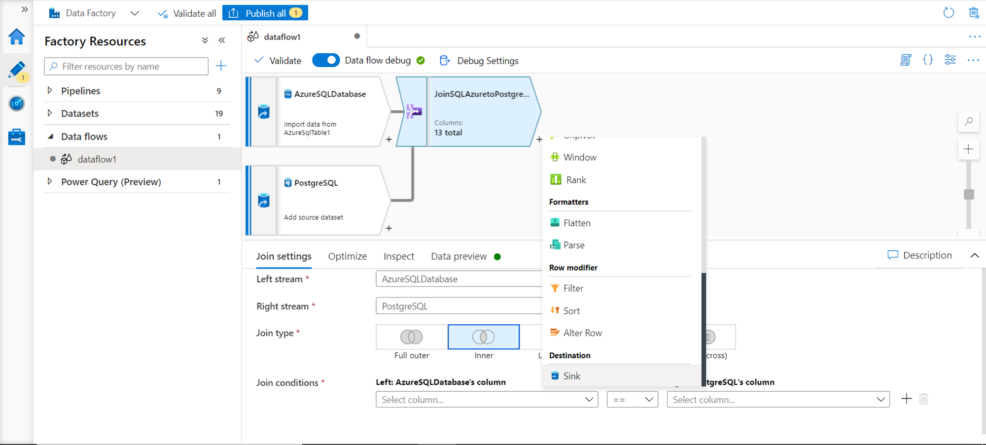 It is assumed that one has sufficient privileges on Azure Data Services on their Azure account. In this exercise, we are going to use Azure SQL Database and Azure Database for PostgreSQL as the source systems. So, the first thing we need is an instance of both database types with at least one table that hosts some sample data in it. These tables also need to have at least one attribute in common (for example an ID field) that can be used in our data flow to join these tables.