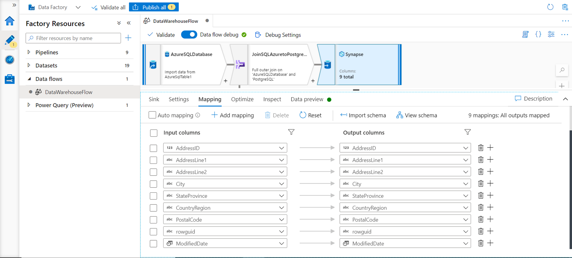 We can configure the mappings which would be mapped automatically if column names match. If you want to modify or view the mappings, uncheck the Auto mapping option and you would be able to see the mappings as shown below. We can also preview the data to ensure that the intended data would be loaded in the data warehouse.