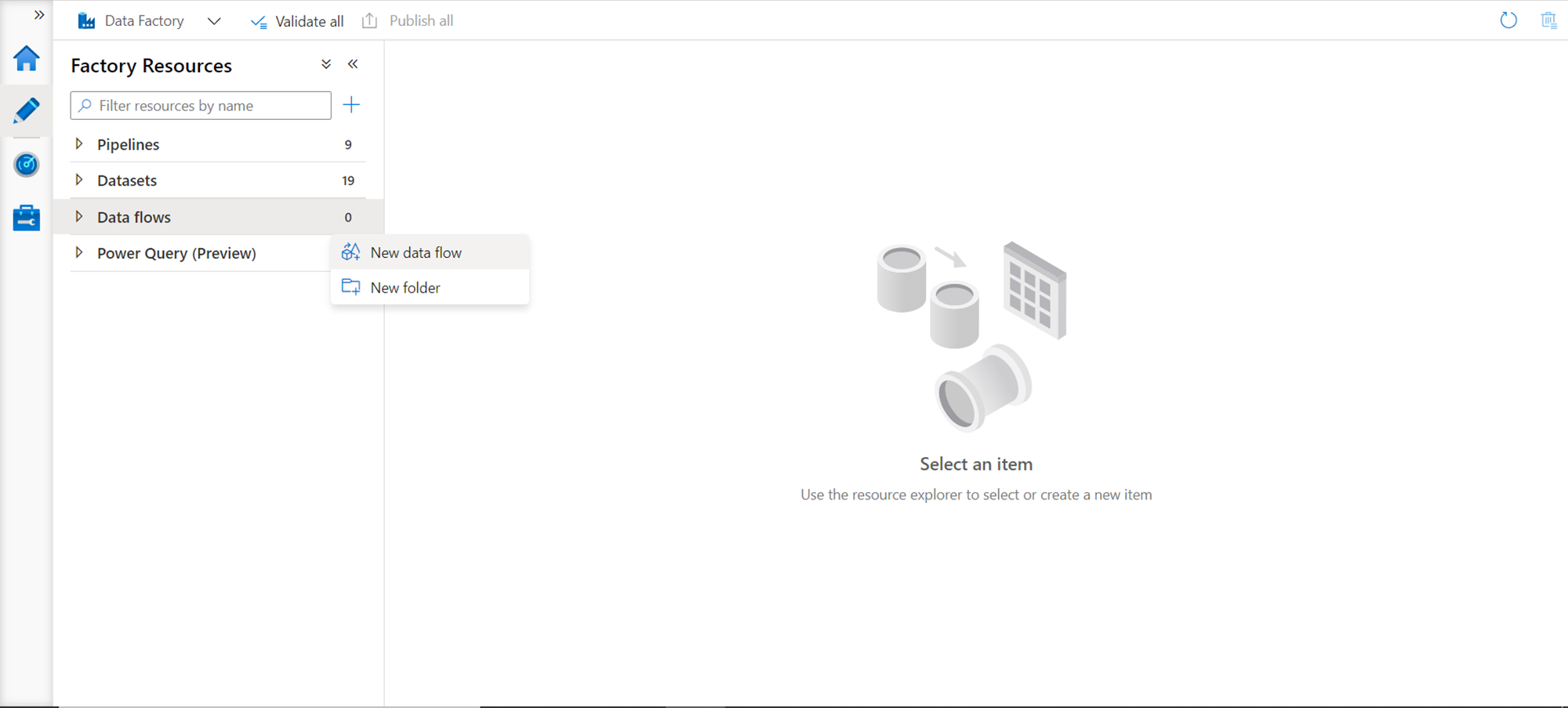 Navigate to the Author tab, click on the Data flows, and select the New data flow menu option as shown below.