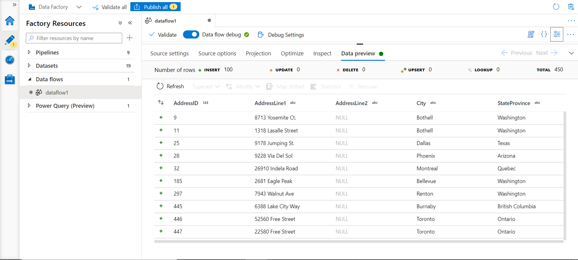 In Azure Data Factory, we have options to preview data in almost every type of object that we create to build a data pipeline as well as a data flow. Click on the Preview tab to see the data as shown below.