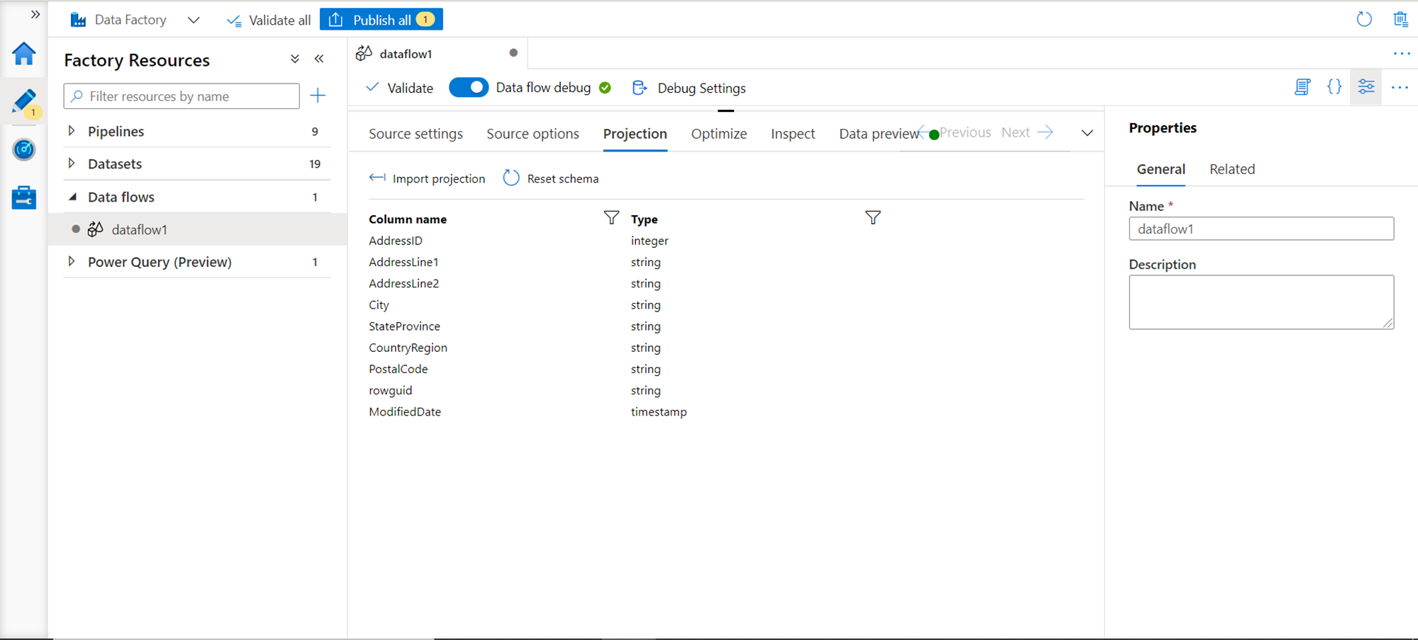 Follow the same steps that we followed for Azure SQL Database. Azure Data Factory provides several settings and options to configure and investigate the data source. Click on the Projection option to view the schema of the data source as shown below.