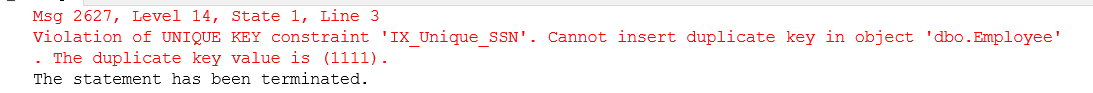 Let’s try to insert few values in this table and see if we are allowed to enter duplicates in the [SocialSecurityNumber] column.