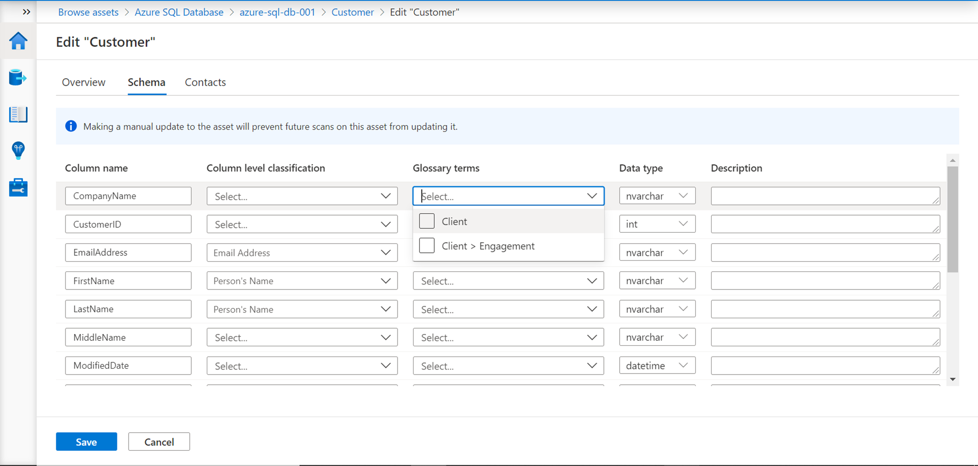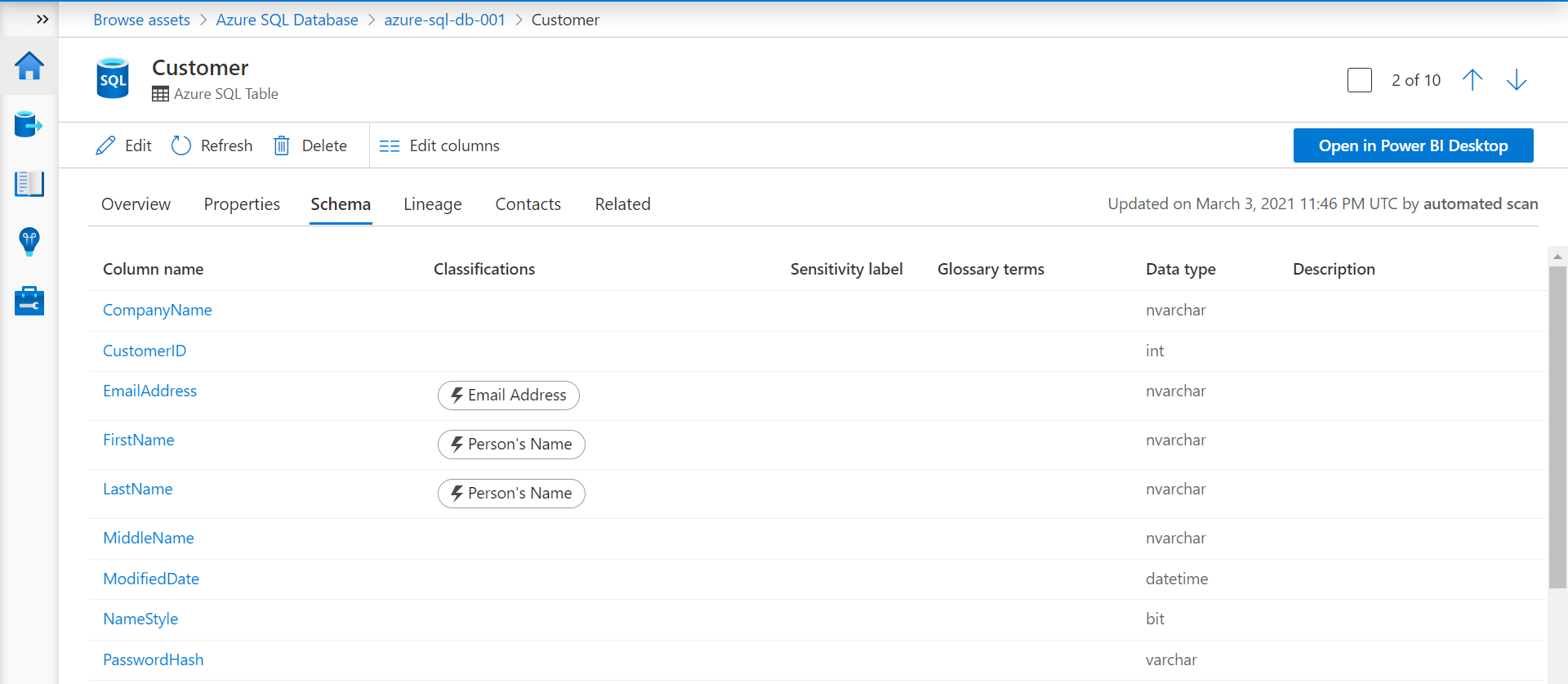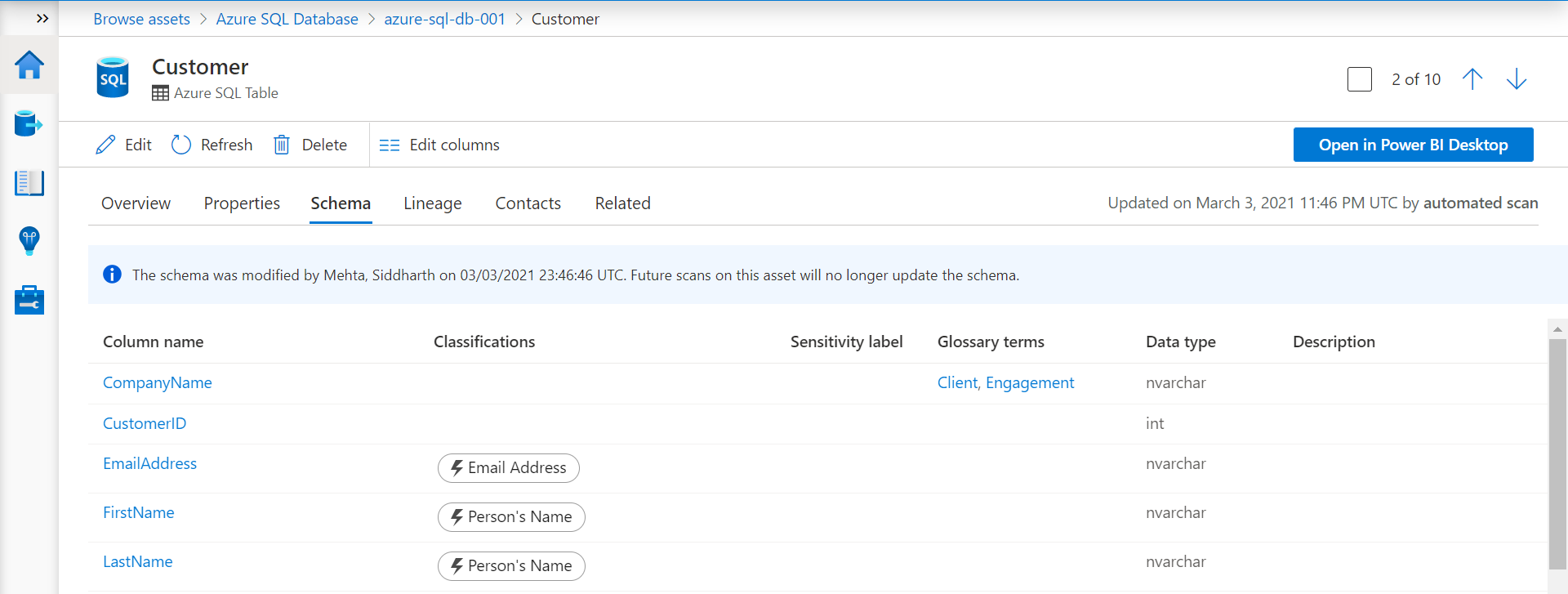 Let’s take a view at the schema of this table to explore the classification as well as tagging of glossary terms at an attribute level. In this case, it looks as shown below. Attributes like Email Addresses are auto classified using the built-in classification templates available in Azure Purview. But business terms association is a business-specific activity that needs to be performed by data stewards, at least initially.