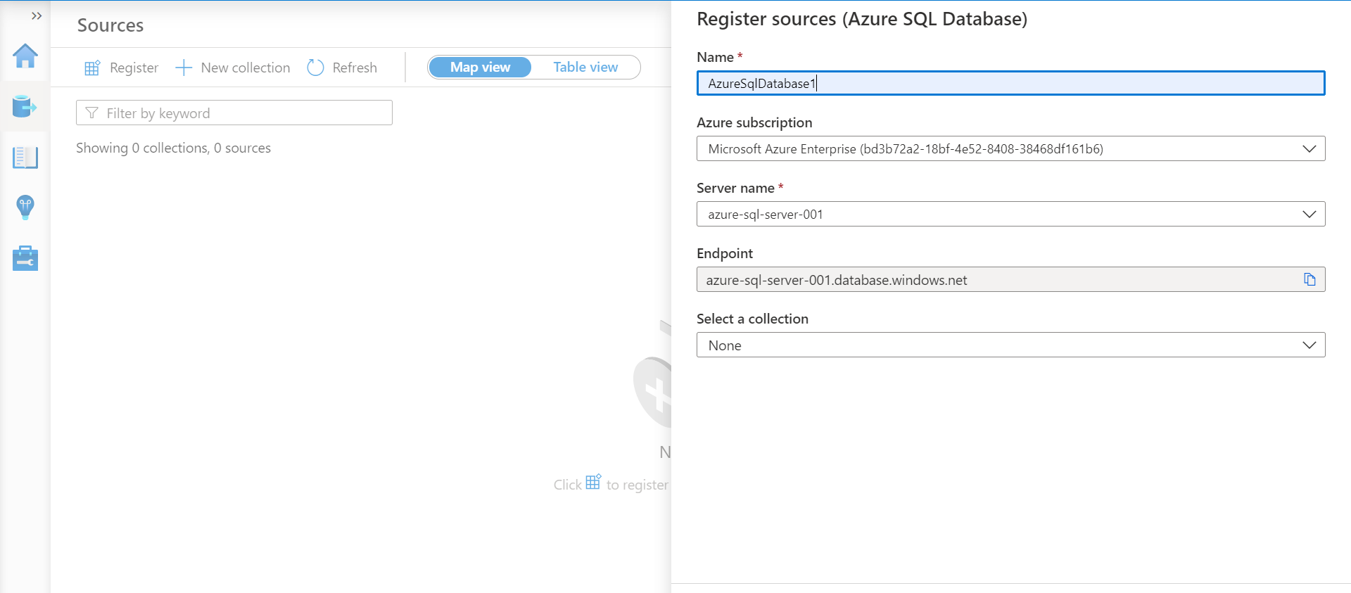 In this step, we need to provide the name of the source that we are going to register. Then once we select the Azure subscription, Azure SQL Databases in this subscription will be listed and we can select the appropriate one from the list as shown below. Once we click on the Register button it would get registered.