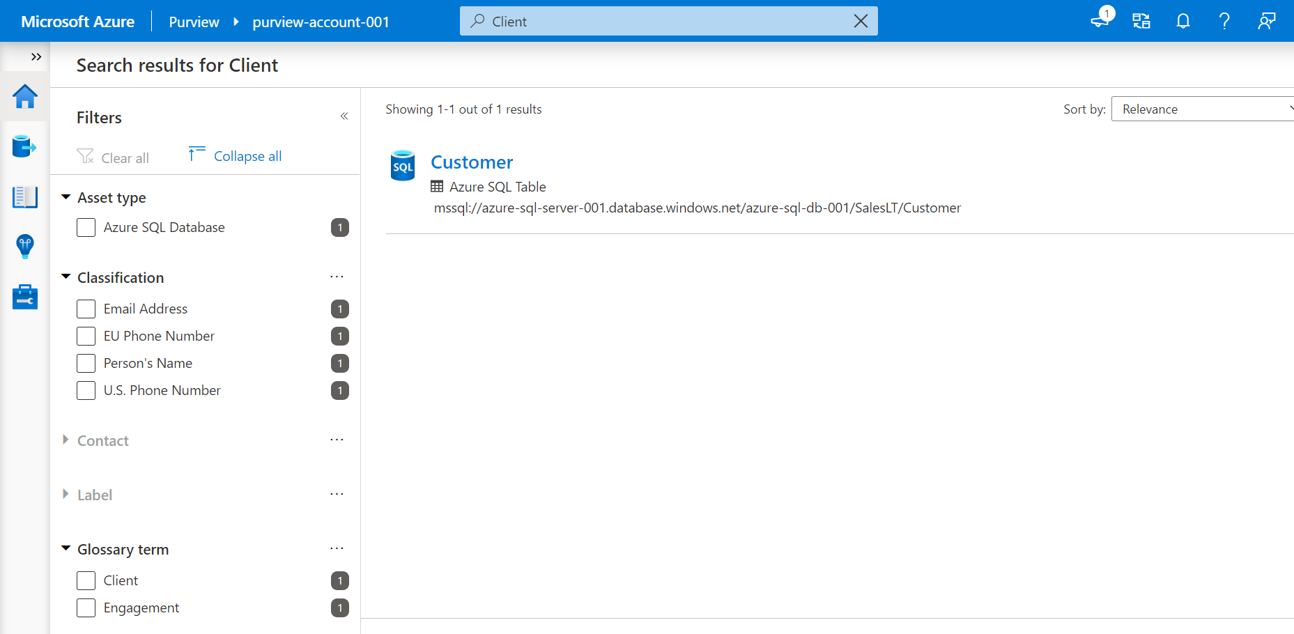 As we have now associated the term from the glossary with this data assets, it should be discoverable as well when we are browsing the assets and looking for assets that are related to a specific standard term that may be defined in the glossary. To test this, navigate to the home page, on the top search bar key in the word “Client” and hit the enter button to search for this term. The result would list the Customer table though we searched for the word Client. The reason for this is that we associated this term from the glossary to this data object, and the search intelligently identified it as classified as a relevant result for the search, which is exactly the objective that we wanted to achieve.